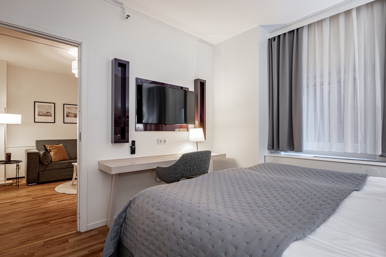 Elbilsladdare finns i parkeringshuset bredevid hotellet. (Sadelplatsen 2)